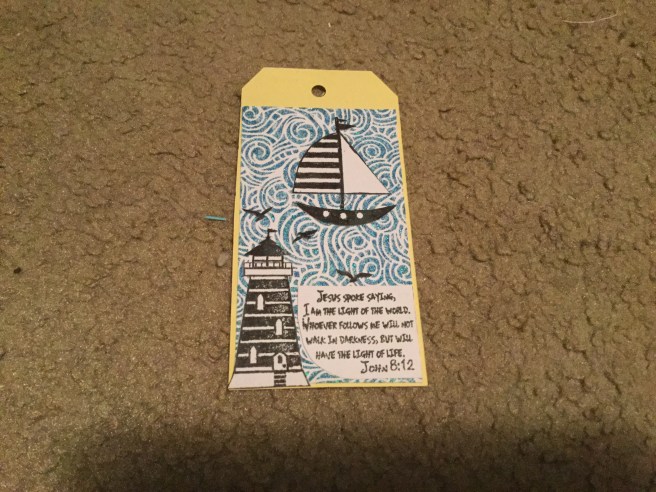 . I then stamped from the beacon set the lighthouse, sailboat and the 3 seagulls from Maymay’s set Beacon and used memento black onto white cardstock , fussy cut out. I put the lighthouse on the bottom left corner covering all the water to create land then added the sailboat towards the middle/right. And i put the 3 seagulls around the lighthouse added the sentiment from the Beacon stamp set John 8:12. I enjoyed creating this tag for my #scrapbook “Tags” with maymay #Stamps